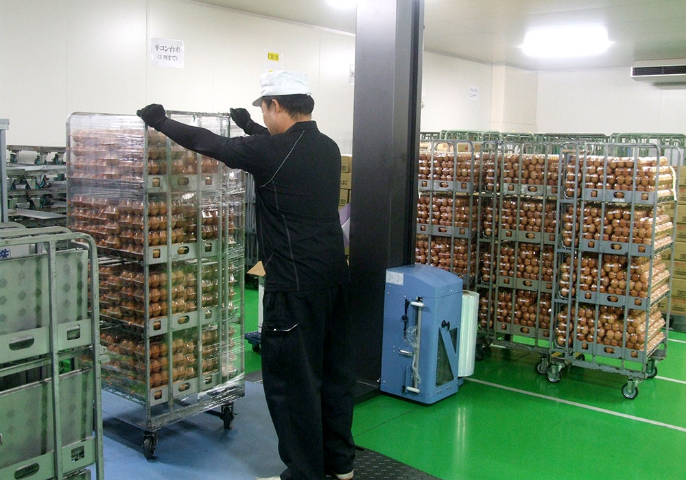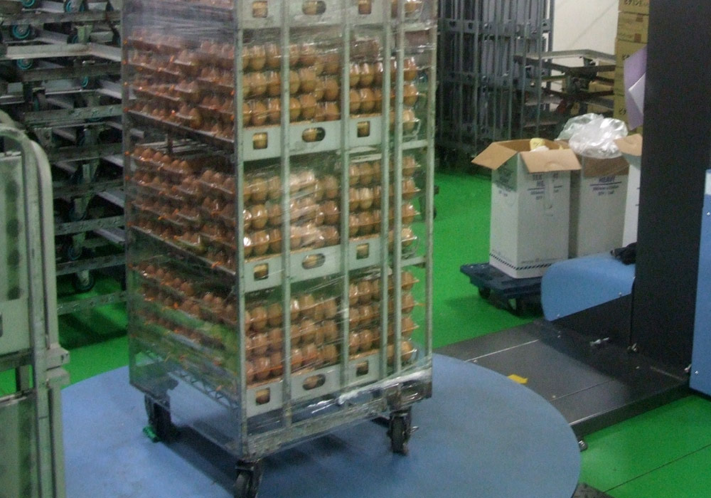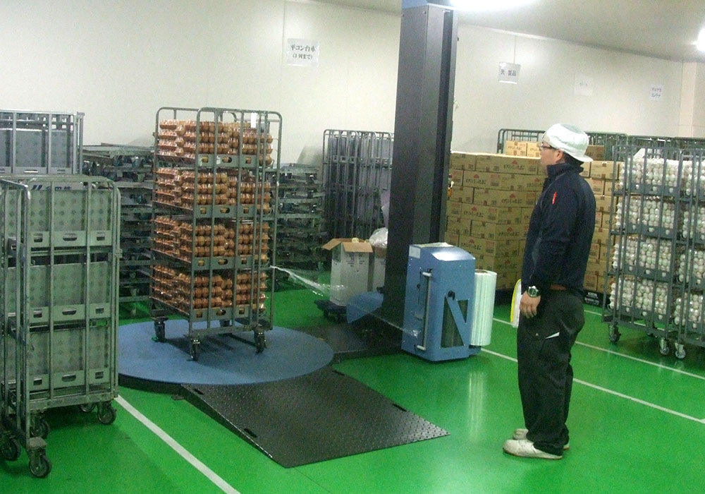 鶏卵出荷場の構内で、出荷用の貨物にラップを巻くお仕事です。